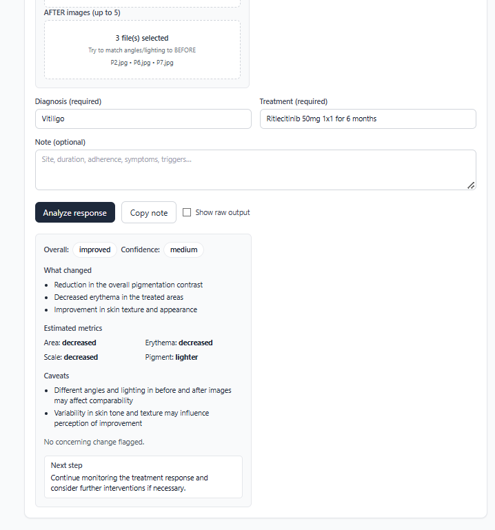 Bring the image together with symptoms, timing, medications, and history so the output feels closer to how dermatologists actually think.